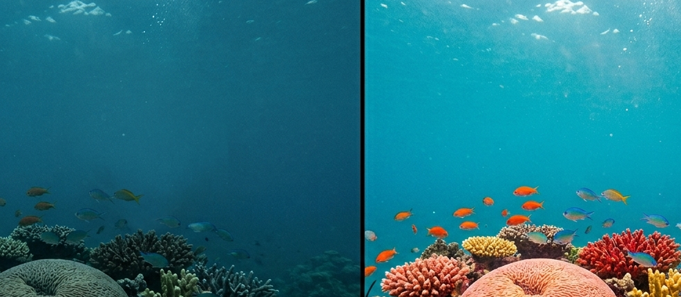 The Disappearing Red: Water molecules absorb long-wavelength red light most quickly, typically disappearing completely at a depth of 5 meters. This is why unfiltered underwater photos always appear grayish-blue-green. Industrial cameras use special CC (color compensation) filters or built-in white balance algorithms to forcibly recover the "lost red" at the hardware level.